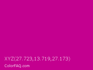 XYZ 27.723,13.719,27.173 Color is a normal magenta color and the nearest color is Red Violet #c71585. Hex code #c4008f and RGB value is rgb(196,0,143). In RGB color space, this color is composed of 77% red, 0% green, 56% blue, In CMYK color space, this color is composed of 0% cyan, 100% magenta, 27% yellow , 23% black , In HSL color space, this color has a hue angle of 316° , 100% saturation and 38% lightness.