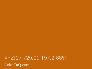 XYZ 27.729,21.197,2.888 Color is a normal orange color and the nearest color is Alloy Orange #c46210. Hex code #c56509 and RGB value is rgb(197,101,9). In RGB color space, this color is composed of 77% red, 40% green, 4% blue, In CMYK color space, this color is composed of 0% cyan, 49% magenta, 95% yellow , 23% black , In HSL color space, this color has a hue angle of 29° , 91% saturation and 40% lightness.