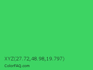 XYZ 27.72,48.98,19.797 Color is a normal green color and the nearest color is UFO Green #3cd070. Hex code #3dd463 and RGB value is rgb(61,212,99). In RGB color space, this color is composed of 24% red, 83% green, 39% blue, In CMYK color space, this color is composed of 71% cyan, 0% magenta, 53% yellow , 17% black , In HSL color space, this color has a hue angle of 135° , 64% saturation and 54% lightness.