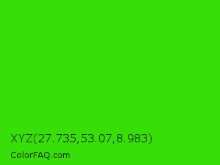 XYZ 27.735,53.07,8.983 Color is a normal green color and the nearest color is Harlequin Green #46cb18. Hex code #37de07 and RGB value is rgb(55,222,7). In RGB color space, this color is composed of 22% red, 87% green, 3% blue, In CMYK color space, this color is composed of 75% cyan, 0% magenta, 97% yellow , 13% black , In HSL color space, this color has a hue angle of 107° , 94% saturation and 45% lightness.