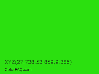 XYZ 27.738,53.859,9.386 Color is a normal green color and the nearest color is Neon Green #39ff14. Hex code #2be00f and RGB value is rgb(43,224,15). In RGB color space, this color is composed of 17% red, 88% green, 6% blue, In CMYK color space, this color is composed of 81% cyan, 0% magenta, 93% yellow , 12% black , In HSL color space, this color has a hue angle of 112° , 87% saturation and 47% lightness.