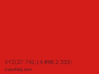 XYZ 27.742,14.898,2.333 Color is a normal red color and the nearest color is Maximum Red #d92121. Hex code #d41c19 and RGB value is rgb(212,28,25). In RGB color space, this color is composed of 83% red, 11% green, 10% blue, In CMYK color space, this color is composed of 0% cyan, 87% magenta, 88% yellow , 17% black , In HSL color space, this color has a hue angle of 1° , 79% saturation and 46% lightness.