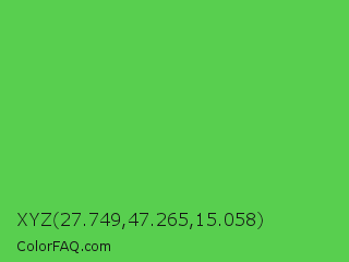XYZ 27.749,47.265,15.058 Color is a normal green color and the nearest color is Mantis #74c365. Hex code #58cf4f and RGB value is rgb(88,207,79). In RGB color space, this color is composed of 35% red, 81% green, 31% blue, In CMYK color space, this color is composed of 57% cyan, 0% magenta, 62% yellow , 19% black , In HSL color space, this color has a hue angle of 116° , 57% saturation and 56% lightness.