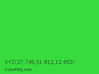 XYZ 27.749,51.812,12.953 Color is a normal green color and the nearest color is Lime Green #32cd32. Hex code #37db3d and RGB value is rgb(55,219,61). In RGB color space, this color is composed of 22% red, 86% green, 24% blue, In CMYK color space, this color is composed of 75% cyan, 0% magenta, 72% yellow , 14% black , In HSL color space, this color has a hue angle of 122° , 69% saturation and 54% lightness.