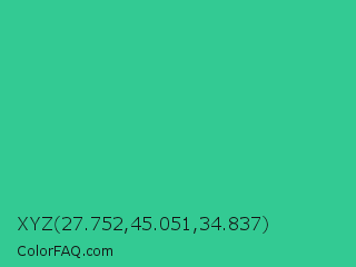 XYZ 27.752,45.051,34.837 Color is a normal green color and the nearest color is Shamrock #33cc99. Hex code #33ca93 and RGB value is rgb(51,202,147). In RGB color space, this color is composed of 20% red, 79% green, 58% blue, In CMYK color space, this color is composed of 75% cyan, 0% magenta, 27% yellow , 21% black , In HSL color space, this color has a hue angle of 158° , 60% saturation and 50% lightness.