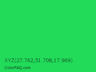 XYZ 27.762,51.708,17.969 Color is a normal green color and the nearest color is Malachite #0bda51. Hex code #21db59 and RGB value is rgb(33,219,89). In RGB color space, this color is composed of 13% red, 86% green, 35% blue, In CMYK color space, this color is composed of 85% cyan, 0% magenta, 59% yellow , 14% black , In HSL color space, this color has a hue angle of 138° , 74% saturation and 49% lightness.