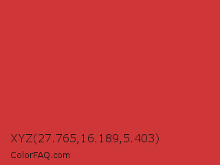 XYZ 27.765,16.189,5.403 Color is a normal red color and the nearest color is Madder Lake #cc3336. Hex code #cf3638 and RGB value is rgb(207,54,56). In RGB color space, this color is composed of 81% red, 21% green, 22% blue, In CMYK color space, this color is composed of 0% cyan, 74% magenta, 73% yellow , 19% black , In HSL color space, this color has a hue angle of 359° , 61% saturation and 51% lightness.