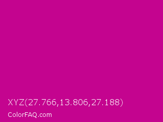 XYZ 27.766,13.806,27.188 Color is a normal magenta color and the nearest color is Red Violet #c71585. Hex code #c4048f and RGB value is rgb(196,4,143). In RGB color space, this color is composed of 77% red, 2% green, 56% blue, In CMYK color space, this color is composed of 0% cyan, 98% magenta, 27% yellow , 23% black , In HSL color space, this color has a hue angle of 317° , 96% saturation and 39% lightness.