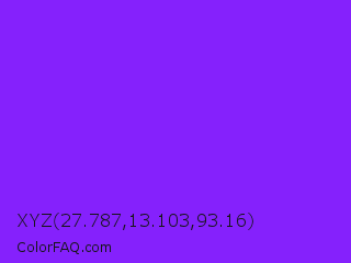 XYZ 27.787,13.103,93.16 Color is a normal violet color and the nearest color is Blue Violet #8a2be2. Hex code #8521fc and RGB value is rgb(133,33,252). In RGB color space, this color is composed of 52% red, 13% green, 99% blue, In CMYK color space, this color is composed of 47% cyan, 87% magenta, 0% yellow , 1% black , In HSL color space, this color has a hue angle of 267° , 97% saturation and 56% lightness.