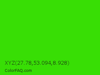XYZ 27.78,53.094,8.928 Color is a normal green color and the nearest color is Harlequin Green #46cb18. Hex code #38de05 and RGB value is rgb(56,222,5). In RGB color space, this color is composed of 22% red, 87% green, 2% blue, In CMYK color space, this color is composed of 75% cyan, 0% magenta, 98% yellow , 13% black , In HSL color space, this color has a hue angle of 106° , 96% saturation and 45% lightness.