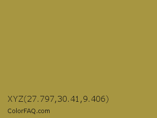 XYZ 27.797,30.41,9.406 Color is a normal yellow color and the nearest color is Brass #b5a642. Hex code #a79641 and RGB value is rgb(167,150,65). In RGB color space, this color is composed of 65% red, 59% green, 25% blue, In CMYK color space, this color is composed of 0% cyan, 10% magenta, 61% yellow , 35% black , In HSL color space, this color has a hue angle of 50° , 44% saturation and 45% lightness.