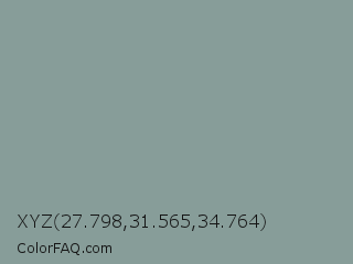 XYZ 27.798,31.565,34.764 Color is a normal cyan color and the nearest color is Granny Smith #84a0a0. Hex code #879d99 and RGB value is rgb(135,157,153). In RGB color space, this color is composed of 53% red, 62% green, 60% blue, In CMYK color space, this color is composed of 14% cyan, 0% magenta, 3% yellow , 38% black , In HSL color space, this color has a hue angle of 169° , 10% saturation and 57% lightness.