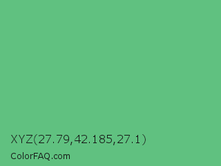 XYZ 27.79,42.185,27.1 Color is a normal green color and the nearest color is Emerald #50c878. Hex code #60c180 and RGB value is rgb(96,193,128). In RGB color space, this color is composed of 38% red, 76% green, 50% blue, In CMYK color space, this color is composed of 50% cyan, 0% magenta, 34% yellow , 24% black , In HSL color space, this color has a hue angle of 140° , 44% saturation and 57% lightness.