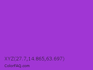 XYZ 27.7,14.865,63.697 Color is a normal purple color and the nearest color is Dark Orchid #9932cc. Hex code #a036d4 and RGB value is rgb(160,54,212). In RGB color space, this color is composed of 63% red, 21% green, 83% blue, In CMYK color space, this color is composed of 25% cyan, 75% magenta, 0% yellow , 17% black , In HSL color space, this color has a hue angle of 280° , 65% saturation and 52% lightness.