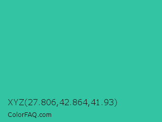 XYZ 27.806,42.864,41.93 Color is a normal cyan color and the nearest color is Shamrock #33cc99. Hex code #33c4a4 and RGB value is rgb(51,196,164). In RGB color space, this color is composed of 20% red, 77% green, 64% blue, In CMYK color space, this color is composed of 74% cyan, 0% magenta, 16% yellow , 23% black , In HSL color space, this color has a hue angle of 167° , 59% saturation and 48% lightness.