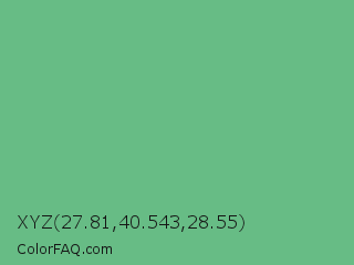 XYZ 27.81,40.543,28.55 Color is a normal green color and the nearest color is Silver Tree #66b58f. Hex code #67bc85 and RGB value is rgb(103,188,133). In RGB color space, this color is composed of 40% red, 74% green, 52% blue, In CMYK color space, this color is composed of 45% cyan, 0% magenta, 29% yellow , 26% black , In HSL color space, this color has a hue angle of 141° , 39% saturation and 57% lightness.