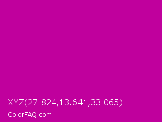 XYZ 27.824,13.641,33.065 Color is a normal magenta color and the nearest color is Red Violet #c71585. Hex code #c0009d and RGB value is rgb(192,0,157). In RGB color space, this color is composed of 75% red, 0% green, 62% blue, In CMYK color space, this color is composed of 0% cyan, 100% magenta, 18% yellow , 25% black , In HSL color space, this color has a hue angle of 311° , 100% saturation and 38% lightness.