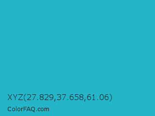 XYZ 27.829,37.658,61.06 Color is a normal cyan color and the nearest color is Ball Blue #21abcd. Hex code #25b5c9 and RGB value is rgb(37,181,201). In RGB color space, this color is composed of 15% red, 71% green, 79% blue, In CMYK color space, this color is composed of 82% cyan, 10% magenta, 0% yellow , 21% black , In HSL color space, this color has a hue angle of 187° , 69% saturation and 47% lightness.