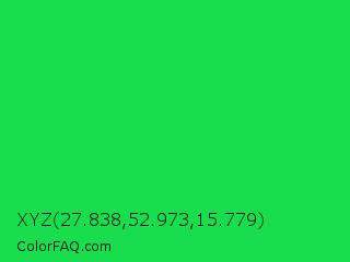 XYZ 27.838,52.973,15.779 Color is a normal green color and the nearest color is Malachite #0bda51. Hex code #18de4d and RGB value is rgb(24,222,77). In RGB color space, this color is composed of 9% red, 87% green, 30% blue, In CMYK color space, this color is composed of 89% cyan, 0% magenta, 65% yellow , 13% black , In HSL color space, this color has a hue angle of 136° , 80% saturation and 48% lightness.