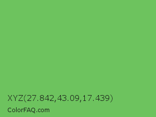 XYZ 27.842,43.09,17.439 Color is a normal green color and the nearest color is Mantis #74c365. Hex code #6dc35e and RGB value is rgb(109,195,94). In RGB color space, this color is composed of 43% red, 76% green, 37% blue, In CMYK color space, this color is composed of 44% cyan, 0% magenta, 52% yellow , 24% black , In HSL color space, this color has a hue angle of 111° , 46% saturation and 57% lightness.