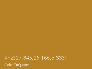 XYZ 27.845,26.166,5.333 Color is a normal orange color and the nearest color is University Of California Gold #b78727. Hex code #b78225 and RGB value is rgb(183,130,37). In RGB color space, this color is composed of 72% red, 51% green, 15% blue, In CMYK color space, this color is composed of 0% cyan, 29% magenta, 80% yellow , 28% black , In HSL color space, this color has a hue angle of 38° , 66% saturation and 43% lightness.