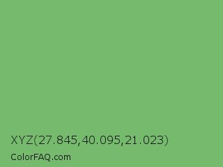 XYZ 27.845,40.095,21.023 Color is a normal green color and the nearest color is Iguana Green #71bc78. Hex code #76ba6e and RGB value is rgb(118,186,110). In RGB color space, this color is composed of 46% red, 73% green, 43% blue, In CMYK color space, this color is composed of 37% cyan, 0% magenta, 41% yellow , 27% black , In HSL color space, this color has a hue angle of 114° , 36% saturation and 58% lightness.