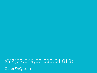 XYZ 27.849,37.585,64.818 Color is a normal cyan color and the nearest color is Turquoise Surf #00c5cd. Hex code #05b5cf and RGB value is rgb(5,181,207). In RGB color space, this color is composed of 2% red, 71% green, 81% blue, In CMYK color space, this color is composed of 98% cyan, 13% magenta, 0% yellow , 19% black , In HSL color space, this color has a hue angle of 188° , 95% saturation and 42% lightness.