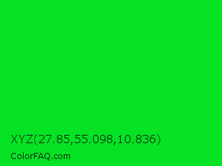 XYZ 27.85,55.098,10.836 Color is a normal green color and the nearest color is Vivid Malachite #00cc33. Hex code #05e324 and RGB value is rgb(5,227,36). In RGB color space, this color is composed of 2% red, 89% green, 14% blue, In CMYK color space, this color is composed of 98% cyan, 0% magenta, 84% yellow , 11% black , In HSL color space, this color has a hue angle of 128° , 96% saturation and 45% lightness.