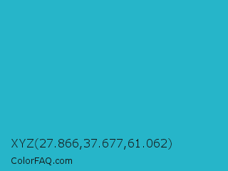 XYZ 27.866,37.677,61.062 Color is a normal cyan color and the nearest color is Ball Blue #21abcd. Hex code #26b5c9 and RGB value is rgb(38,181,201). In RGB color space, this color is composed of 15% red, 71% green, 79% blue, In CMYK color space, this color is composed of 81% cyan, 10% magenta, 0% yellow , 21% black , In HSL color space, this color has a hue angle of 187° , 68% saturation and 47% lightness.