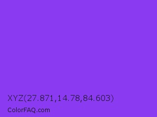XYZ 27.871,14.78,84.603 Color is a normal violet color and the nearest color is Blue Violet #8a2be2. Hex code #8a3af1 and RGB value is rgb(138,58,241). In RGB color space, this color is composed of 54% red, 23% green, 95% blue, In CMYK color space, this color is composed of 43% cyan, 76% magenta, 0% yellow , 5% black , In HSL color space, this color has a hue angle of 266° , 87% saturation and 59% lightness.