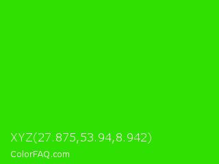XYZ 27.875,53.94,8.942 Color is a normal green color and the nearest color is Harlequin #3fff00. Hex code #30e000 and RGB value is rgb(48,224,0). In RGB color space, this color is composed of 19% red, 88% green, 0% blue, In CMYK color space, this color is composed of 79% cyan, 0% magenta, 100% yellow , 12% black , In HSL color space, this color has a hue angle of 107° , 100% saturation and 44% lightness.