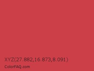 XYZ 27.882,16.873,8.091 Color is a normal red color and the nearest color is English Vermillion #cc474b. Hex code #cc3f49 and RGB value is rgb(204,63,73). In RGB color space, this color is composed of 80% red, 25% green, 29% blue, In CMYK color space, this color is composed of 0% cyan, 69% magenta, 64% yellow , 20% black , In HSL color space, this color has a hue angle of 356° , 58% saturation and 52% lightness.