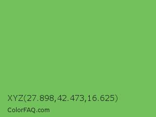 XYZ 27.898,42.473,16.625 Color is a normal green color and the nearest color is Mantis #74c365. Hex code #72c15b and RGB value is rgb(114,193,91). In RGB color space, this color is composed of 45% red, 76% green, 36% blue, In CMYK color space, this color is composed of 41% cyan, 0% magenta, 53% yellow , 24% black , In HSL color space, this color has a hue angle of 106° , 45% saturation and 56% lightness.