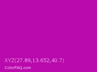 XYZ 27.89,13.652,40.7 Color is a normal magenta color and the nearest color is Heliotrope Magenta #aa00bb. Hex code #ba09ad and RGB value is rgb(186,9,173). In RGB color space, this color is composed of 73% red, 4% green, 68% blue, In CMYK color space, this color is composed of 0% cyan, 95% magenta, 7% yellow , 27% black , In HSL color space, this color has a hue angle of 304° , 91% saturation and 38% lightness.