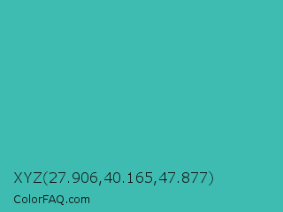XYZ 27.906,40.165,47.877 Color is a normal cyan color and the nearest color is Puerto Rico #3fc1aa. Hex code #3ebcb1 and RGB value is rgb(62,188,177). In RGB color space, this color is composed of 24% red, 74% green, 69% blue, In CMYK color space, this color is composed of 67% cyan, 0% magenta, 6% yellow , 26% black , In HSL color space, this color has a hue angle of 175° , 50% saturation and 49% lightness.