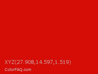 XYZ 27.908,14.597,1.519 Color is a normal red color and the nearest color is Rosso Corsa #d40000. Hex code #d60d06 and RGB value is rgb(214,13,6). In RGB color space, this color is composed of 84% red, 5% green, 2% blue, In CMYK color space, this color is composed of 0% cyan, 94% magenta, 97% yellow , 16% black , In HSL color space, this color has a hue angle of 2° , 95% saturation and 43% lightness.