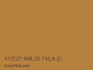 XYZ 27.908,25.742,8.2 Color is a normal orange color and the nearest color is Copper #b87333. Hex code #b6803f and RGB value is rgb(182,128,63). In RGB color space, this color is composed of 71% red, 50% green, 25% blue, In CMYK color space, this color is composed of 0% cyan, 30% magenta, 65% yellow , 29% black , In HSL color space, this color has a hue angle of 33° , 49% saturation and 48% lightness.