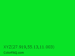 XYZ 27.919,55.13,11.003 Color is a normal green color and the nearest color is Vivid Malachite #00cc33. Hex code #08e326 and RGB value is rgb(8,227,38). In RGB color space, this color is composed of 3% red, 89% green, 15% blue, In CMYK color space, this color is composed of 96% cyan, 0% magenta, 83% yellow , 11% black , In HSL color space, this color has a hue angle of 128° , 93% saturation and 46% lightness.