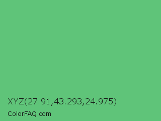 XYZ 27.91,43.293,24.975 Color is a normal green color and the nearest color is Emerald #50c878. Hex code #5fc479 and RGB value is rgb(95,196,121). In RGB color space, this color is composed of 37% red, 77% green, 47% blue, In CMYK color space, this color is composed of 52% cyan, 0% magenta, 38% yellow , 23% black , In HSL color space, this color has a hue angle of 135° , 46% saturation and 57% lightness.