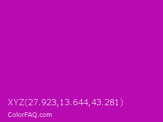 XYZ 27.923,13.644,43.281 Color is a normal magenta color and the nearest color is Heliotrope Magenta #aa00bb. Hex code #b80bb2 and RGB value is rgb(184,11,178). In RGB color space, this color is composed of 72% red, 4% green, 70% blue, In CMYK color space, this color is composed of 0% cyan, 94% magenta, 3% yellow , 28% black , In HSL color space, this color has a hue angle of 302° , 89% saturation and 38% lightness.