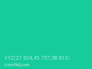 XYZ 27.924,45.757,38.813 Color is a normal cyan color and the nearest color is Caribbean Green #00cc99. Hex code #16cc9c and RGB value is rgb(22,204,156). In RGB color space, this color is composed of 9% red, 80% green, 61% blue, In CMYK color space, this color is composed of 89% cyan, 0% magenta, 24% yellow , 20% black , In HSL color space, this color has a hue angle of 164° , 81% saturation and 44% lightness.