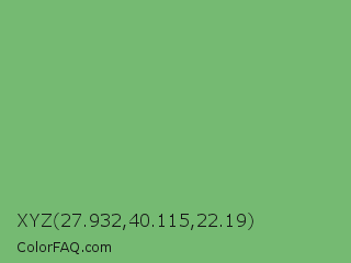 XYZ 27.932,40.115,22.19 Color is a normal green color and the nearest color is Iguana Green #71bc78. Hex code #75ba72 and RGB value is rgb(117,186,114). In RGB color space, this color is composed of 46% red, 73% green, 45% blue, In CMYK color space, this color is composed of 37% cyan, 0% magenta, 39% yellow , 27% black , In HSL color space, this color has a hue angle of 118° , 34% saturation and 59% lightness.