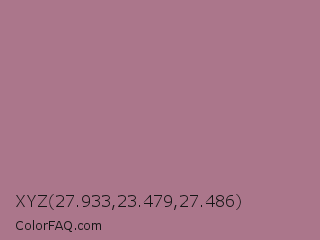 XYZ 27.933,23.479,27.486 Color is a normal rose color and the nearest color is Turkish Rose #b57281. Hex code #ab768b and RGB value is rgb(171,118,139). In RGB color space, this color is composed of 67% red, 46% green, 55% blue, In CMYK color space, this color is composed of 0% cyan, 31% magenta, 19% yellow , 33% black , In HSL color space, this color has a hue angle of 336° , 24% saturation and 57% lightness.