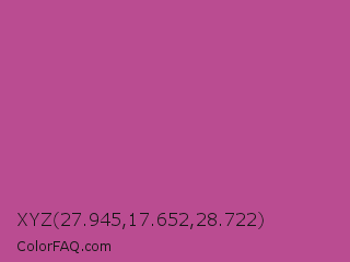 XYZ 27.945,17.652,28.722 Color is a normal magenta color and the nearest color is Mulberry #c54b8c. Hex code #ba4c91 and RGB value is rgb(186,76,145). In RGB color space, this color is composed of 73% red, 30% green, 57% blue, In CMYK color space, this color is composed of 0% cyan, 59% magenta, 22% yellow , 27% black , In HSL color space, this color has a hue angle of 322° , 44% saturation and 51% lightness.