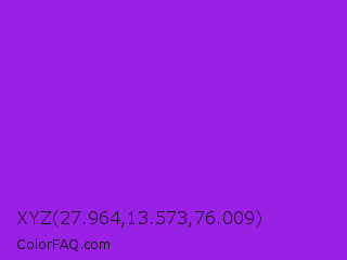 XYZ 27.964,13.573,76.009 Color is a normal purple color and the nearest color is Veronica #a020f0. Hex code #9921e6 and RGB value is rgb(153,33,230). In RGB color space, this color is composed of 60% red, 13% green, 90% blue, In CMYK color space, this color is composed of 33% cyan, 86% magenta, 0% yellow , 10% black , In HSL color space, this color has a hue angle of 277° , 80% saturation and 52% lightness.