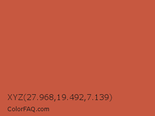 XYZ 27.968,19.492,7.139 Color is a normal red color and the nearest color is Dark Coral #cd5b45. Hex code #c75840 and RGB value is rgb(199,88,64). In RGB color space, this color is composed of 78% red, 35% green, 25% blue, In CMYK color space, this color is composed of 0% cyan, 56% magenta, 68% yellow , 22% black , In HSL color space, this color has a hue angle of 11° , 55% saturation and 52% lightness.