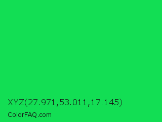 XYZ 27.971,53.011,17.145 Color is a normal green color and the nearest color is Malachite #0bda51. Hex code #12de54 and RGB value is rgb(18,222,84). In RGB color space, this color is composed of 7% red, 87% green, 33% blue, In CMYK color space, this color is composed of 92% cyan, 0% magenta, 62% yellow , 13% black , In HSL color space, this color has a hue angle of 139° , 85% saturation and 47% lightness.