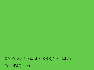 XYZ 27.974,46.333,13.947 Color is a normal green color and the nearest color is Mantis #74c365. Hex code #63cc4a and RGB value is rgb(99,204,74). In RGB color space, this color is composed of 39% red, 80% green, 29% blue, In CMYK color space, this color is composed of 51% cyan, 0% magenta, 64% yellow , 20% black , In HSL color space, this color has a hue angle of 108° , 56% saturation and 55% lightness.