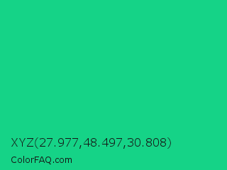 XYZ 27.977,48.497,30.808 Color is a normal green color and the nearest color is Caribbean Green #00cc99. Hex code #15d387 and RGB value is rgb(21,211,135). In RGB color space, this color is composed of 8% red, 83% green, 53% blue, In CMYK color space, this color is composed of 90% cyan, 0% magenta, 36% yellow , 17% black , In HSL color space, this color has a hue angle of 156° , 82% saturation and 45% lightness.