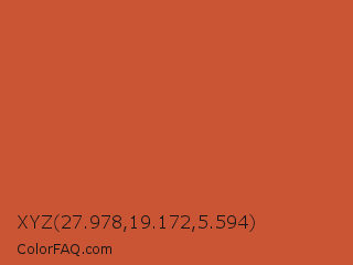 XYZ 27.978,19.172,5.594 Color is a normal red color and the nearest color is Tuscany #bd5e2e. Hex code #c95535 and RGB value is rgb(201,85,53). In RGB color space, this color is composed of 79% red, 33% green, 21% blue, In CMYK color space, this color is composed of 0% cyan, 58% magenta, 74% yellow , 21% black , In HSL color space, this color has a hue angle of 13° , 58% saturation and 50% lightness.
